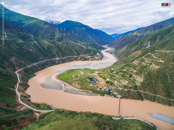 只要過橋,就進(jìn)出一次西藏了。兩岸有許多的大拐彎。我們在江邊起飛。拍攝這里的梯田,在如此艱險(xiǎn)的地段都能夠生活下來,需要多少的努力和汗水。